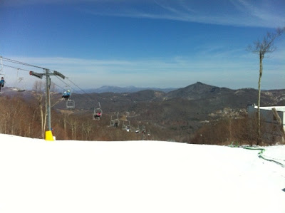 a group of us traveled to Sugar Mountain, North Carolina Presidents' Day weekend; we picked a great weekend to go because it ended up snowing pretty much the whole time! this was my second time skiing and after a couple of runs down the mountain, i'd like to say that i picked it up and was doing pretty well. i only fell twice the whole trip; once when getting out of the car, i slipped on ice & landed on my hip (i still have a gnarly bruise on my thigh) & the other time i fell, i took T down with me. it happened right below the ski-lift, so everyone riding probably had a pretty big laugh at the two of us. i accidentally skied into T while trying to stop and somehow our skis got interlocked. this resulted in me turned backwards with my bum in the air screaming at T to somehow stop us. we ended up falling in a tangled mess & i didn't have my gloves on so my hands were freezing. we even attracted the Ski Patrol who came over to make sure we were OK! looking back i crack up when i think of the show we provided for everyone on the mountain.